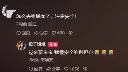 11月1日,她曾发布一条在酒店房间跳舞的视频,有一位女性网友在评论区问她:怎么去柬埔寨了,注意安全!“橙子姐姐”在评论区回复该网友:过来玩宝宝 我很安全的别担心。