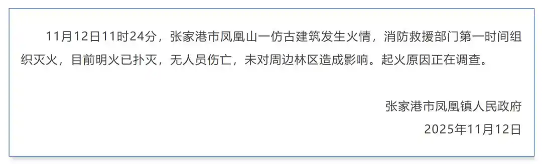 张家港市凤凰镇人民政府12日通报:11月12日11时24分,张家港市凤凰山一仿古建筑发生火情,消防救援部门第一时间组织灭火,目前明火已扑灭,无人员伤亡,未对周边林区造成影响。起火原因正在调查。