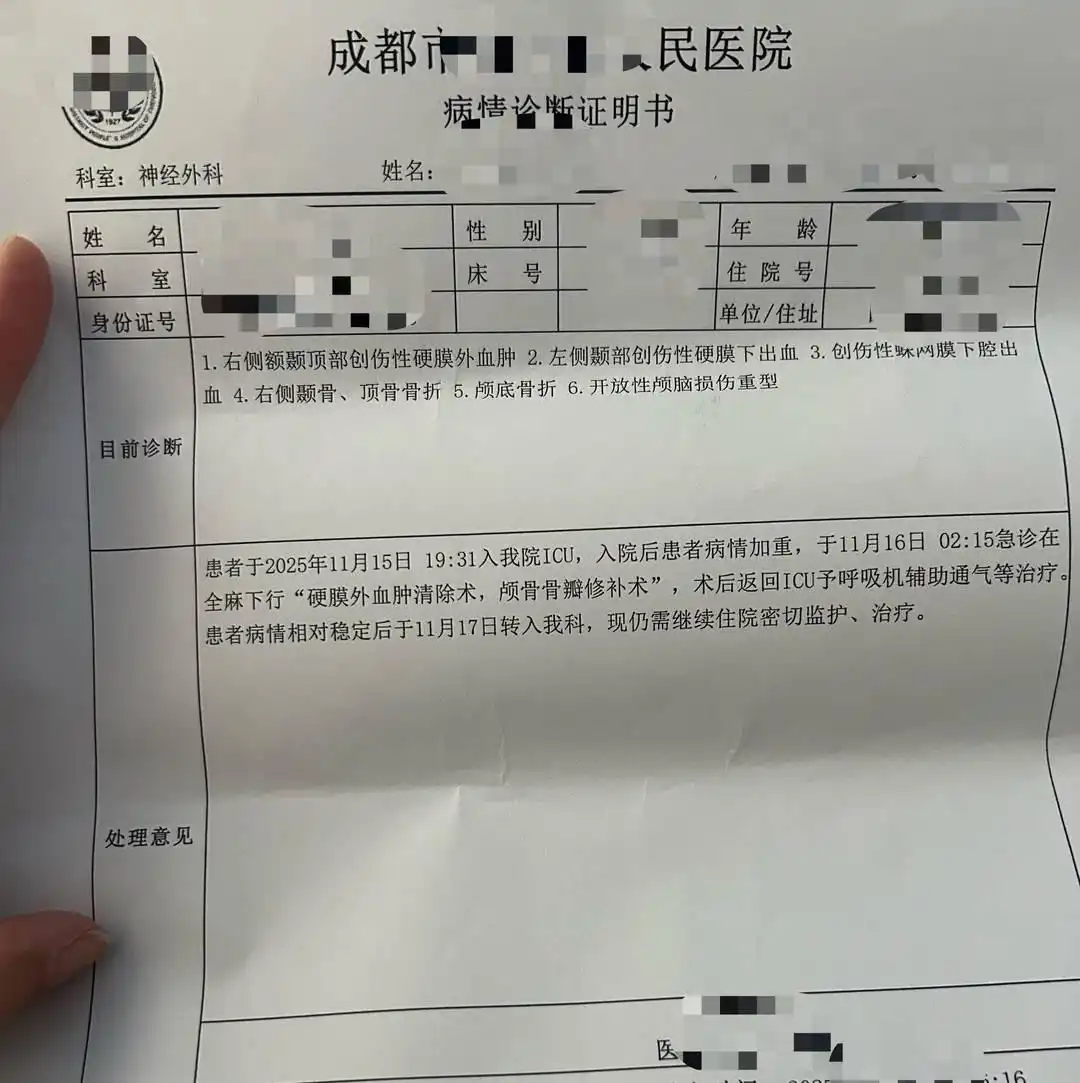 11月18日,记者在新都区某医院见到了受伤女生的姐姐程女士(化名),她告诉记者,受伤女生是新都区某高校的大二学生,事故发生后,妹妹的受伤情况还是挺严重的,当晚就被送完了医院,紧急做了开颅手术,“我们接到医院打来的电话,我的父母从西昌赶过来,我从雅安赶过来。”